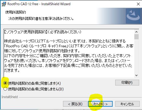 4.RootPro CAD使用許諾画面となります。「同意します」にチェックして「次へ」をクリックします。
