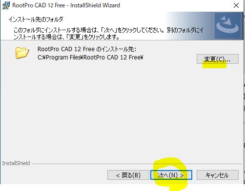 5.RootPro CADのインストールするフォルダを選ぶ画面ですがCプログラムになっていれば特別な事情がない限り問題はないと思います。「次へ」をクリック。